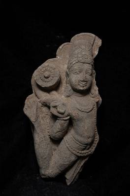 | Description / विवरण | Vidyadhara in flight, holding full blown lotus flower by stalk in the right hand, left hand broken. |