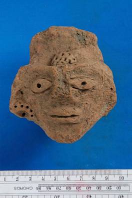 | Description / विवरण | Terracotta head with raised eyes. Applied dotted urna mark on the face head. Left earring lost. |