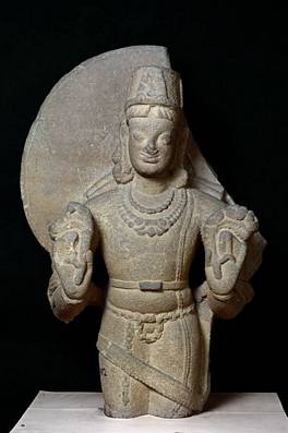 | Description / विवरण | A large section of the plain halo has broken off and the portion below the knees is missing. The God, in udicayavesa, holds a bunch of lotus flowers with short stalks in each hand. He wears a short cylindrical crown high over the head revealing ringlets of hair which fall over the forehead and to the shoulders. The jewellery consists of earrings an ekavali a necklace made up of double strings of beads with a central plaque an avyanga which passes over a pearl upavita and a chain girdle, the loose end of which forms a loop between the legs to dangle over the right thigh. The edge of the tunic is brocaded and a baldric is slung across the thighs. Cf. Cat. 398, Pl. CXXVI which is very similar in style and date. |