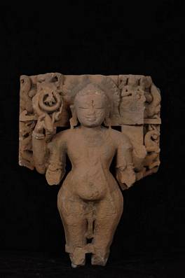 | Description / विवरण | Vamana incarnation of Visnu standing in samabhanga. All four hands broken but the lotus stalk originally held in the upper right hand is intact. Only the upper part of the image stele is preserved showing, besides the usual motifs of makara transom and vyala, Varahavatara on the right side and Narasimhavatara on the left. Vamana is depicted as vatuka with small curls and a pot belly. |