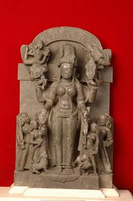 | Description / विवरण | Four-armed Parvati, standing in samabhanga, stretches the lower right hand in varada and holds lotus flower in the upper right and trisula and ghanta in the left hands. She is flanked by female cauri-bearers as well as Jaya and Vijaya carrying danda or sword on the sides. Lion is represented on the proper right and mutilated deer on the left of her feet placed on a lotus. Her head is flanked by a malavidyadhara on each side, that on the left being defaced. She wears a jatamukuta, kundalas, torque, hara wristlets and anklets and is draped in a sari and scarf which winds round both her arms. This is a typical early medieval art-specimen from the Himalayan hills, characterised by metallic finish, elongation of the figures and an ornamental arched canopy crowning the image. |
