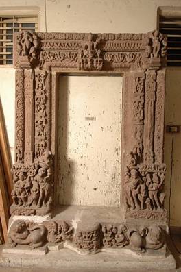 | Description / विवरण | The surround, at present, consists of a sill udumbara , jambs pedya made up of several moldings sakhas with River Goddess groups at the base, which are Saivite in character, and an architrave more surely from a Surya shrine. The udumbara has two crouching lions at the sides, the heads facing to the front and one paw raised to the chest. The central projection mandaraka is in the shape of a lotus flower with intricately carved stalk and a nodule in the form of an incipient kirttimukha. On either side of the mandaraka are pairs of Udadhikumaras holding pots in their hands, each riding a makara with a foliated tail. The base of the left jamb shows the River goddess Yamuna Pl. CXXXV in tribhanga pose standing right next to the doorway opening. She carries a large lotus bud and leans on a headless female attendant behind whom can be seen a partially hidden female parasol bearer. The parasol itself bears a petal design and is shaped like a flower. Below the parasol bearer is a small figure now almost completely destroyed. Next we see the heavy and fierce figure of Nandisvara with four hands and a dagger tucked into the girdle. The lower hands are held at the chest, and the upper hands carry a damaru and a staff to the right of Nandisvara is a small female attendant. The entire group stands on a slab placed above a turtle and a makara with floriated tail. Above Nandisvara are two bharaputrakas carrying a slab on which is carved a scene depicting the worship of the Siva Linga. The base of the right door jamb has a similar group. First the river Ganga carrying a large lotus bud with a female attendant on whom she rests her hand and a male parasol bearer. Next to these, is a damaged dwarflike figure followed by the four-armed Mahakala in one of whose hands is a trident. He is accompanied by a male attendant, now headless. The group stands on a pedestal placed above two makaras with floriated tails. Above are bharaputraka figures carrying a slab on which are figures listening to a discourse. The River goddess groups are surmounted by moldings of the jamb. These consist of a pilaster stambhasakha with ghata-pallava base, the shaft clasped by a kirttimukha band below the capital. A long pendant chain terminating in a tasseled ornament issues from the mouth of the kirttimukha. Above the overflowing pot capital, in the architrave proper, are kumarikas flanked by vyalas, the maiden to the left shown in the act of tying her dhoti and the one to the right adjusting her hair ornament in a mirror. The outermost ovolo moldings bahyasakha show floral scrolls issuing from the navels of seated Yaksas and also extend into the architrave of the door frame. The bands or rupasakhas on the inner side of the stambhasakhas contain mithuna figures in niches. These are topped in the architrave by two- armed guardian figures carrying tridents between whom are flying Vidyadhara couples holding garlands. The nagasakha molding follows next and is formed by the tails of the two Nagas who hover just above the heads of the river goddesses, hands folded in adoration. The innermost band is quite narrow and filled with a floral scroll motif that travels around the door frame. The architrave is interrupted in the center by an image of Surya seated in his chariot of seven horses. He is accompanied by his consorts Rajni and Niksubha, and by Aruna, his charioteer. The uppermost sections of the architrave contain a band filled with interlaced garlands and a row of dentils decorated with small crouching vyala protomes. |