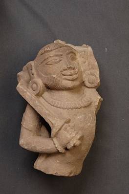 | Description / विवरण | Sword-wielding vidyadhara bust. The figure has bearded and moustached round face and wears karna-kundalas, torque and wristlets. |