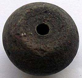 | Description / विवरण | An arica-nut shaped bead, dark grey in colour, perforation across in center. |