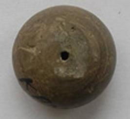 | Description / विवरण | A terracotta arica-nut shaped bead, dull red in colour, perforation across in center. |