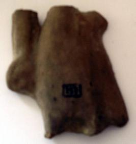 | Description / विवरण | A terracotta plaque, standing male figurine, made of single mould the portion above the belly and below the knees missing the right arm stretched down, the left akimbo, mutilated and grey in colour. |