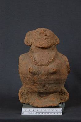 | Description / विवरण | Seated figure of a mother goddess having rounded middle portion. Hands and legs lost. Breast small and pointed. She wears an incised necklace. Face raised upwards. |