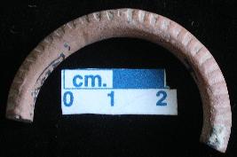| Description / विवरण | Fragment of a terracotta bangle, red in colour, interior smooth and plain, exterior decorated with notched designs having a mid-rib. |
