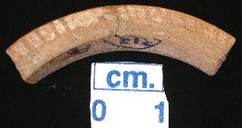 | Description / विवरण | Fragment of a terracotta, red in colour, bangle, triangular section, the outer surface at the base is chamfered, bears vertical notches on the both sides of the mid- rib. |