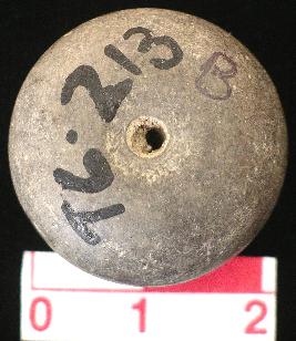 | Description / विवरण | A terracotta arica-nut shape bead, grey in colour, flat base and conical top, vertical hole across. |