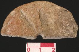 | Description / विवरण | A terracotta disc, possible used as wheel with a central hole, red in clour, half broken, traces of red slip seen. |