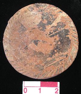 | Description / विवरण | A terracotta disc, treated with red slip all over, black blotches seen on both surfaces, notches on periphery on both sides. |