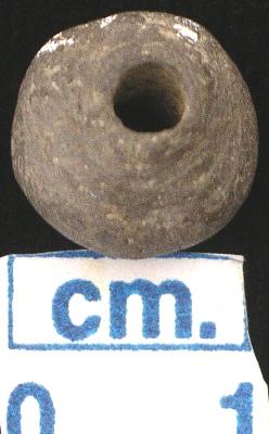 | Description / विवरण | A terracotta bead round shaped, grey in colour, small in size, flat base with conical top, a vertical hole across. |