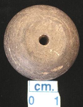 | Description / विवरण | A terracotta arica-nut shape bead, grey in colour, flat base with conical top, a vertical hole across. |