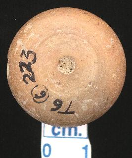 | Description / विवरण | A terracotta arica nut shape bead, red in colour, with conical top, a vertical hole across. |