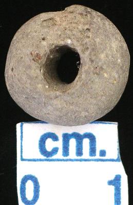 | Description / विवरण | A terracotta bead, small sized with circular shape, grey in coluor, a vertical hole across. |