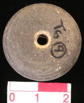 | Description / विवरण | A terracotta Arica-nut shaped bead, grey in colour, flat base with conical top, a vertical hole across, smooth surface. |