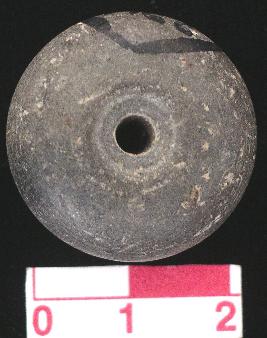 | Description / विवरण | A terracotta arica-nut shape bead, grey I colour, flat base with conical top, a vertical hole across. |