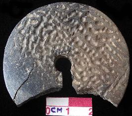| Description / विवरण | A fragment of terracotta disc with perforation in the center, The upper surface is decorated with dents resembling tortoise shell impression. |