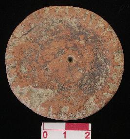 | Description / विवरण | A terracotta disc, red in colour, traces of red slip seen, well fired, hotched decoration pattern on periphery on both sides. |