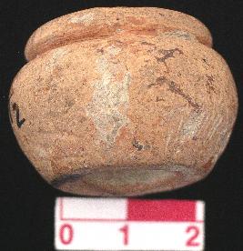 | Description / विवरण | A terracotta Bead, red in colour, traces of red slip seen, a ring base on top like rim of a ghat. The base is flat due to sharp cut, broad hole across. |