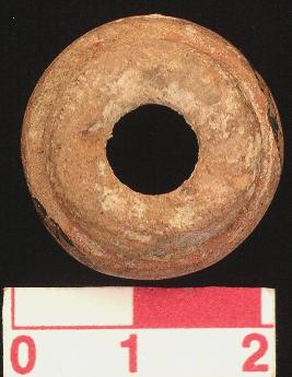 | Description / विवरण | A terracotta bead, red in colour, traces of red slip seen, a ring base on the top like rim of a ghat. The base is flat due to sharp cut, braoad hole across. |