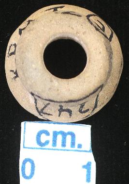 | Description / विवरण | A terracotta bead, small in size, off red colour, flat base and top due to sharp cut, a ring base on the top like rim of a ghat. A broad hole across. |