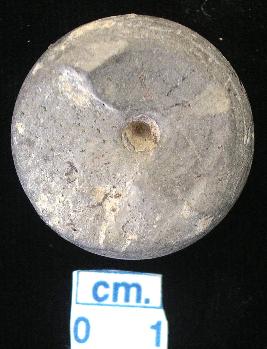 | Description / विवरण | A terracotta arica-nut shaped bead, grey in colour, concealed base with conical top, a vertical hole across, smooth surface. |