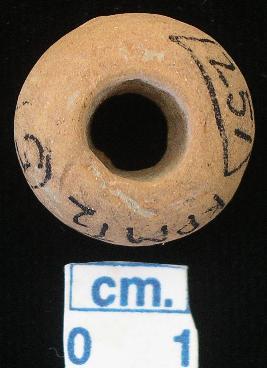 | Description / विवरण | A terracotta ghat shaped bead, red in colour, small in size, a ring base on the top like rim of a ghat. A broad vertical hole across. |
