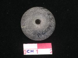 | Description / विवरण | A terracotta bead, grey in colour, flat base and conical top, a vertical hole across. |