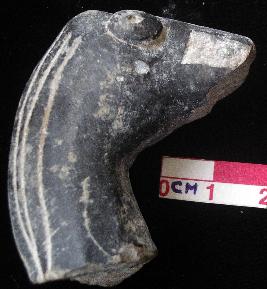 | Description / विवरण | Fragment of a terracotta horse, the body beyond neck and mouth is broken. The eyes are in appliqu with a round puncture each. The neck has mild horizontal grooves representing manes, black polished. The core is grey. |