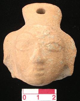 | Description / विवरण | A terracotta human head, red in colour, made with single mould, face showing long broad eyes, high bronis, pointed nose, open mouth, pointed chin. At the back of the head the mass of hair seen and a perforated crest for hanging. |