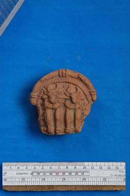| Description / विवरण | Fragment from the front wall of a toy chariot showing two standing bulls. |