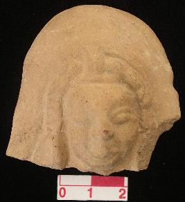 | Description / विवरण | A terracotta plaque, made with single mould, showing a haloed human face, slightly elongated round chin, heavy lower lip, broad nose, elongated eyes, heavy eye-lids, prominent eye brows. The hair arranged in frizzled locks falling on the sides. |