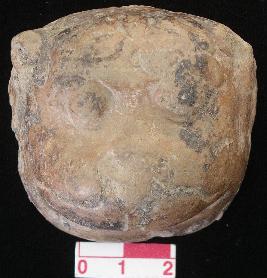 | Description / विवरण | Terracotta face of a lion, made with single mould, showing round protuding eyes, nostrils damaged . Slit mouth, short round ears, manes on the fore head. The upper lip has mustaches engracved off red in colour. |