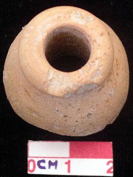 | Description / विवरण | A Terracotta ghat shaped bead, red in colour, a ring base top like rim of a ghat, a broad vertical hole across, |