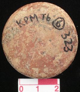 | Description / विवरण | A terracotta knob lid, red in colour and also treated with red slip all over, flat and circular base, a pinched design made on broken top. |
