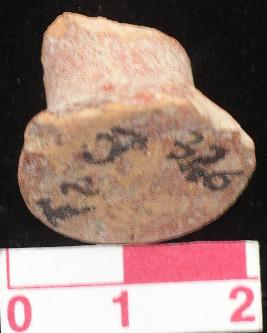| Description / विवरण | Fragment of a terracotta knob-lid, red in colour and also treated with red slip all over, flat base. |