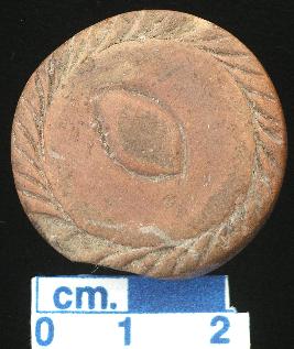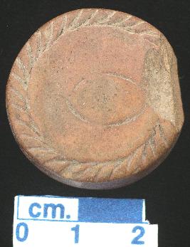 | Description / विवरण | A terracotta disc, treated with red slip all over, well fired, incised eye shape image made in the center of both surfaces and notches on periphery on both sides. |