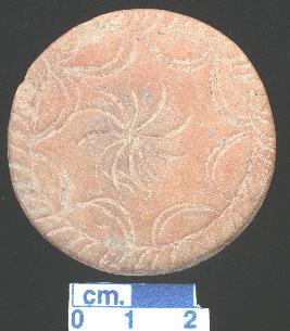 | Description / विवरण | A terracotta disc, red in colour, well fired, notches on periphery on both sides, decorative pattern with half circles with double lines are made near periphery on both sides, Solar symbol made in the central of both sides, while one solar symbol has 9 curved rays curved spokes and another solar symbol has II curved rays curved spokes . |