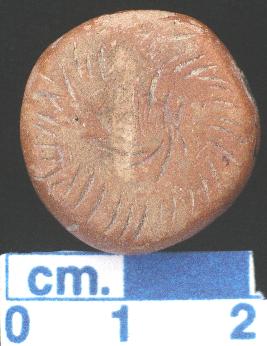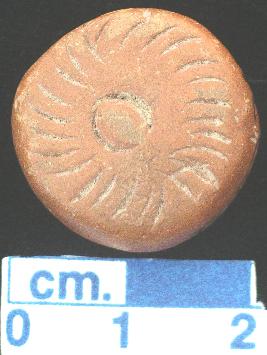 | Description / विवरण | A terracotta disc, small in size red in colour, treated with red slip all over, notches on periphery on both sides. An incised fish shape image made on one side while other side has a small incised circle. |