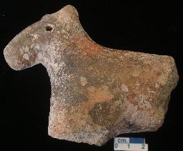 | Description / विवरण | A terracotta horse figurine, treated with red slip all over, long muzzle with round eyes in relief, a side horizontal hole across below the eyes, ears are missing. The hind portion and fore legs are damaged. |