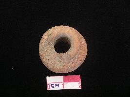 | Description / विवरण | A terracotta bead, partly damaged, ringshaped top, flat base, circular profile, dull red in colour rough surfaces, vertical perforation across. |