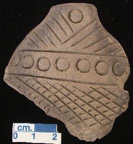 | Description / विवरण | Fragment of a terracotta snake hood, grey in colour. The front portion in decorated with incised circles and oblique notches on the upper port. The middle portion has a horizontal row of incised circles with in two horizontal straight lines, belloe long oblique lines the space in between notched from the opposit direction thus making a check-pattern. |