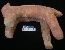 | Description / विवरण | A terracotta animal figurine, possibly a dog with short tail, the portion above the neck and half fore legs are missing , Long body with long back legs. It is hand made and treated with red slip all over which is being peald off. |