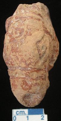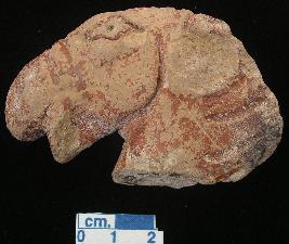 | Description / विवरण | Fragment of a terracotta caprisoned horse, only head portion is available. Treated with red slip all over which is being peald off. It has slit mouth, depressed nostrils, lozenged eyes with a puncture in the middle, indicating the pupils and embossed flower on fore head, both ears are broken. The portion beyond neck is broken. Manes are depicted by vertical strokes. |