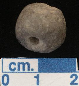 | Description / विवरण | A terracotta bead, grey in colour, irregular round, ill baked, a vertical hole across. |