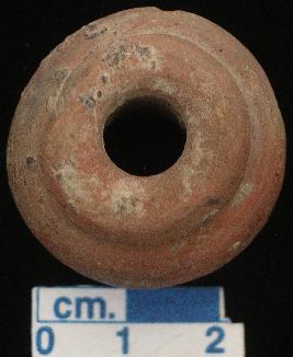 | Description / विवरण | A terracotta ghat shape bead, red in colour, a ring base top like rim of a ghat, flat base due to sharp cut, well fired, a broad vertical hole across. |