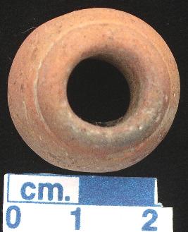 | Description / विवरण | A terracotta ghat shaped bead, reddish in colour, flat base and ring like top, a broad vertical hole across. |