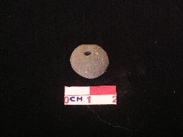 | Description / विवरण | A terracotta bead, grey in colour,irregular ruond, hand made, a hole across in center. |